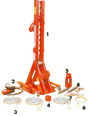 Артикул: HD 71 Производитель: Описание: Это силовые башни, специально предназначенные для вытягивания кабин на стапеле Cab Bench. Цилиндр имеет 2 скорости натяжения, а сила тяги варьируется от 7,5 до 30 тонн (при помощи системы полиспаста). Высота натяжения – до 4,3 м, при этом сила тяги остаётся одинаковой. Возможно применение 2 башен одновременно. Они могут свободно перекатываться вокруг стапеля. При вытягивании башни не крепятся непосредственно к полу, а удерживаются от падения цепью с противоположной стороны. Башни могут доукомплекто-вываться дополнительными захватами для вытягивания, цепями, шкивами для вертикальной тяги, удлинителями и т.д. Комплектация: